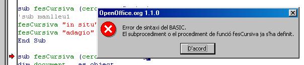 si us heu deixat de copiar la macro fesCursiva (vid supra), us sortirà un missatge d'error com