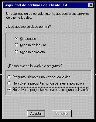 No l'heu de deixar tal com es mostra en aquest tall, que és com surt per defecte, sinó que heu de clicar a "Acceso completo" (altrament no podreu exportar els resultats de les vostres consultes a la C: o a la A:) i la segona "No volver a preguntar nunca para ninguna aplicación" i després cliqueu a "Aceptar".